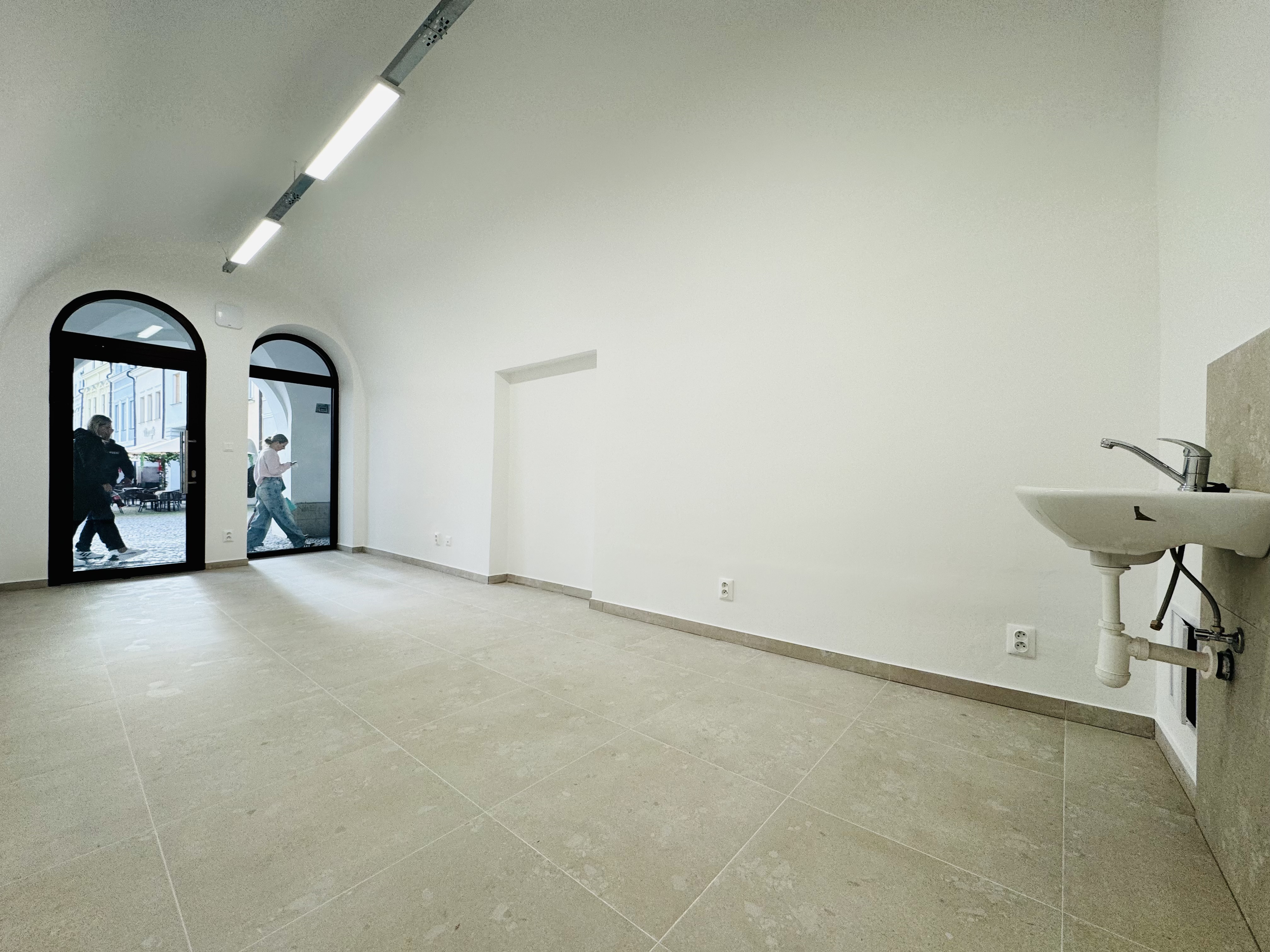 • otvorený, svetlý priestor s vysokým stropom a výkladom do ulice