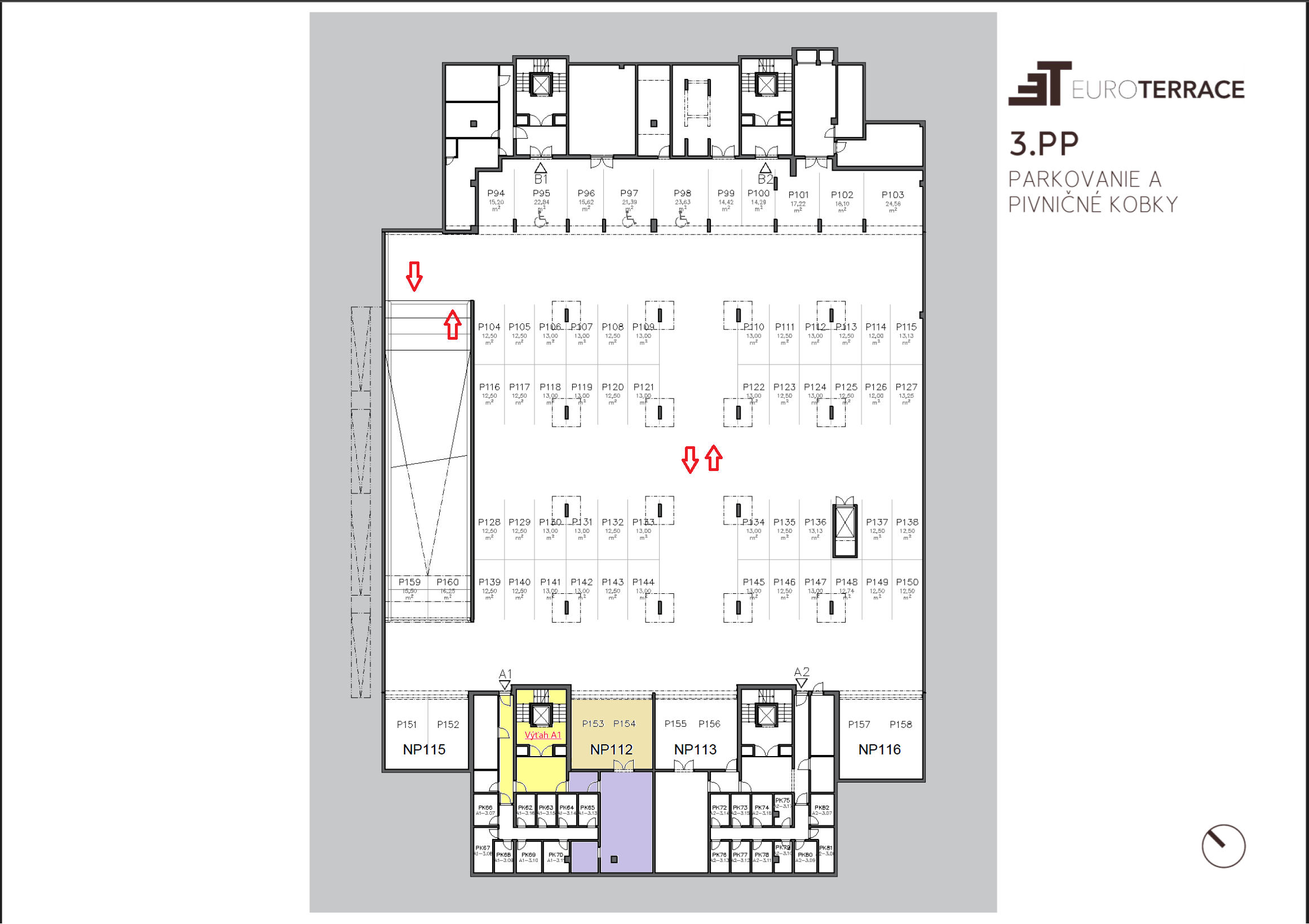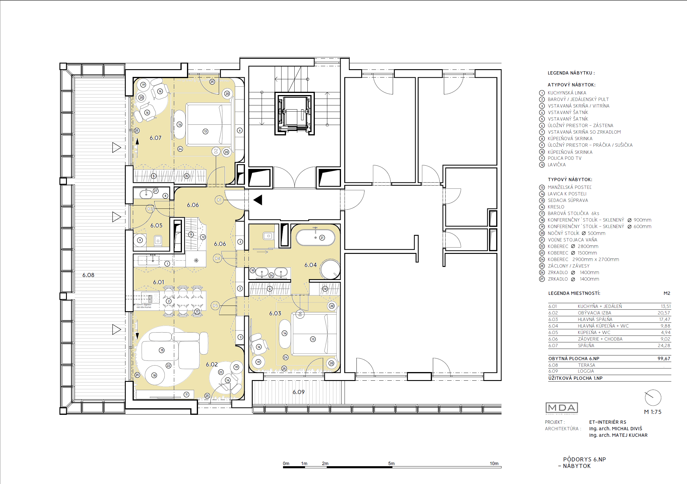 Dispozícia a výmery: Byt – 6. NP má interiér s čistou podlahovou plochou 99,13 m², terasu s výmerou 41,90 m² a loggiu o výmere 5,18 m². Celková plocha bytu vrátane exteriéru predstavuje 146,21 m². K bytu prislúcha priestor v 3. podzemnom podlaží s parkovaním pre 2 vozidlá a miestom pre motorku alebo bicykle o výmere 42,18 m² plus pivničná kobka o výmere 6 m². Celková plocha vrátane parkovania je 194,39 m². Možnosť dokúpenia ešte nebytového priestoru za parkovacím boxom o výmere 46,88 m².